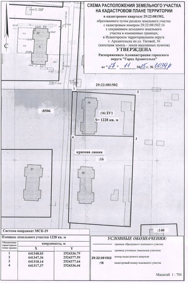 2. Адрес месторасположения земельного участка: г. Архангельск, ул. Тяговая, д. 36. Данный земельный участок расположен в кадастровом квартале 29:22:081502. Утвержденная схема расположения земельного участка: