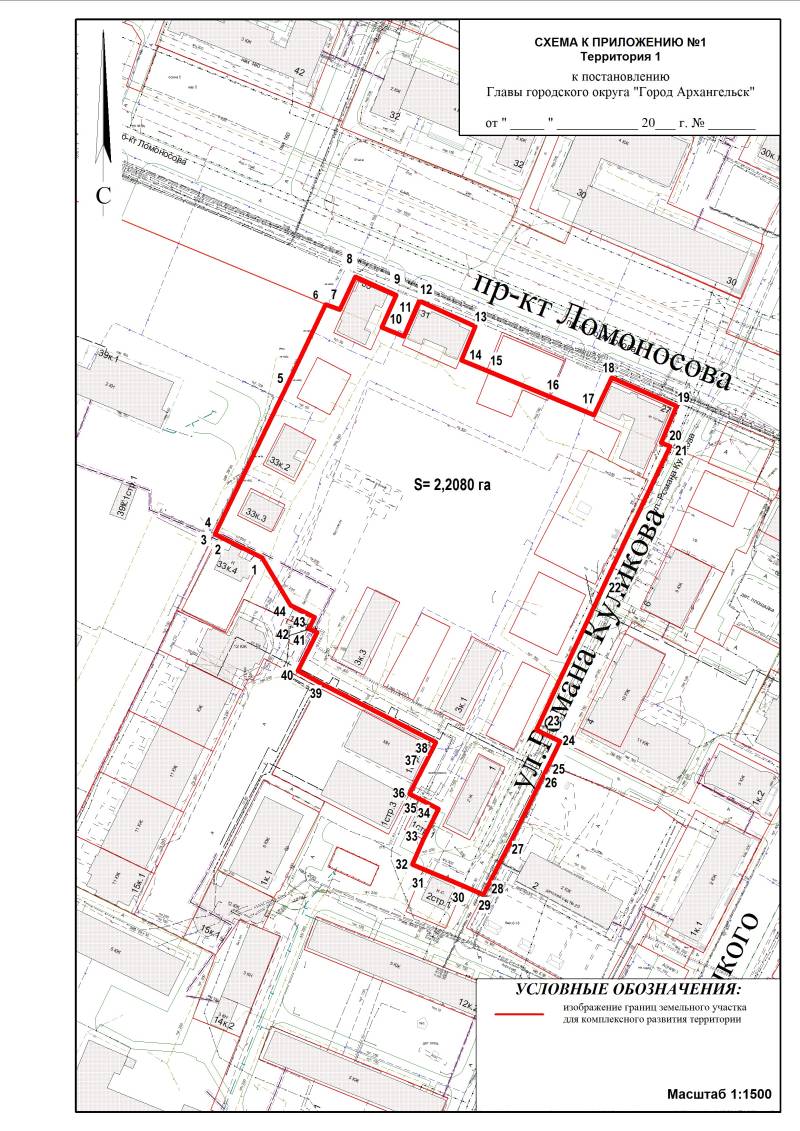 Комплексное развитие территории жилой застройки городского округа "Город Архангельск" в отношении двух несмежных территорий, в границах которых предусматривается осуществление деятельности по комплексному развитию территории, с заключением одного договора о комплексном развитии таких территорий: в границах части элемента планировочной структуры: просп. Ломоносова, ул. Урицкого, наб. Северной Двины, ул. Северодвинская площадью 2,2080 га (Территория 1); в границах части элемента планировочной структуры: просп. Обводный канал, ул. Гагарина, ул. Самойло площадью 0,2989 га (Территория 2)