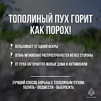 Тополиный пух – настоящий бич городов и сёл. В жаркое время года тополиный пух может стать причиной возникновения пожара, он легко воспламеняется и горит с большой скоростью. Небрежно брошенный окурок или спичка, разведённый костёр, шалость детей с огнём приводит к возгоранию.Горящий тополиный пух может стать причиной серьёзного пожара! НИ В КОЕМ СЛУЧАЕ не поджигайте его!