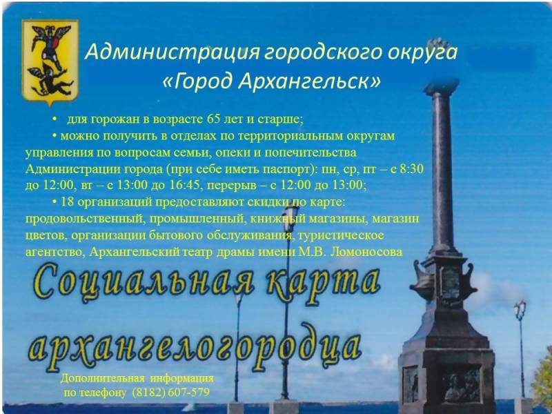 Для горожан в возрасте от 65 лет и старше в Архангельске действует социальная карта архангелогородца, которая дает право ее держателю на получение скидок на товары и услуги.