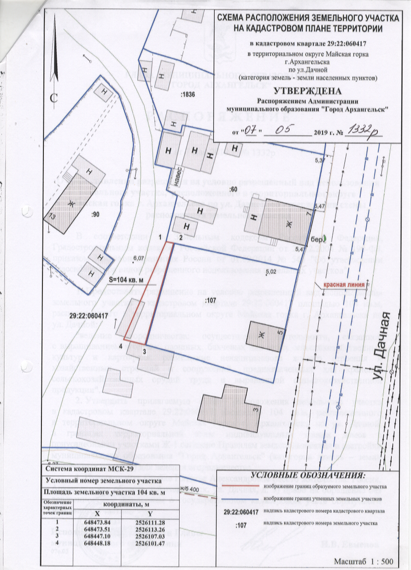 2. Утвердить схему расположения земельного участка в кадастровом квартале 29:22:060417 площадью 104 кв.м, расположенного в территориальном округе Майская горка г.Архангельска по ул. Дачной, в границах территориальной зоны индивидуальных жилых домов с приусадебными участками Ж-1согласно Правилам землепользования и застройки муниципального образования "Город Архангельск" (категория земель – земли населенных пунктов) для ведения огородничества.
