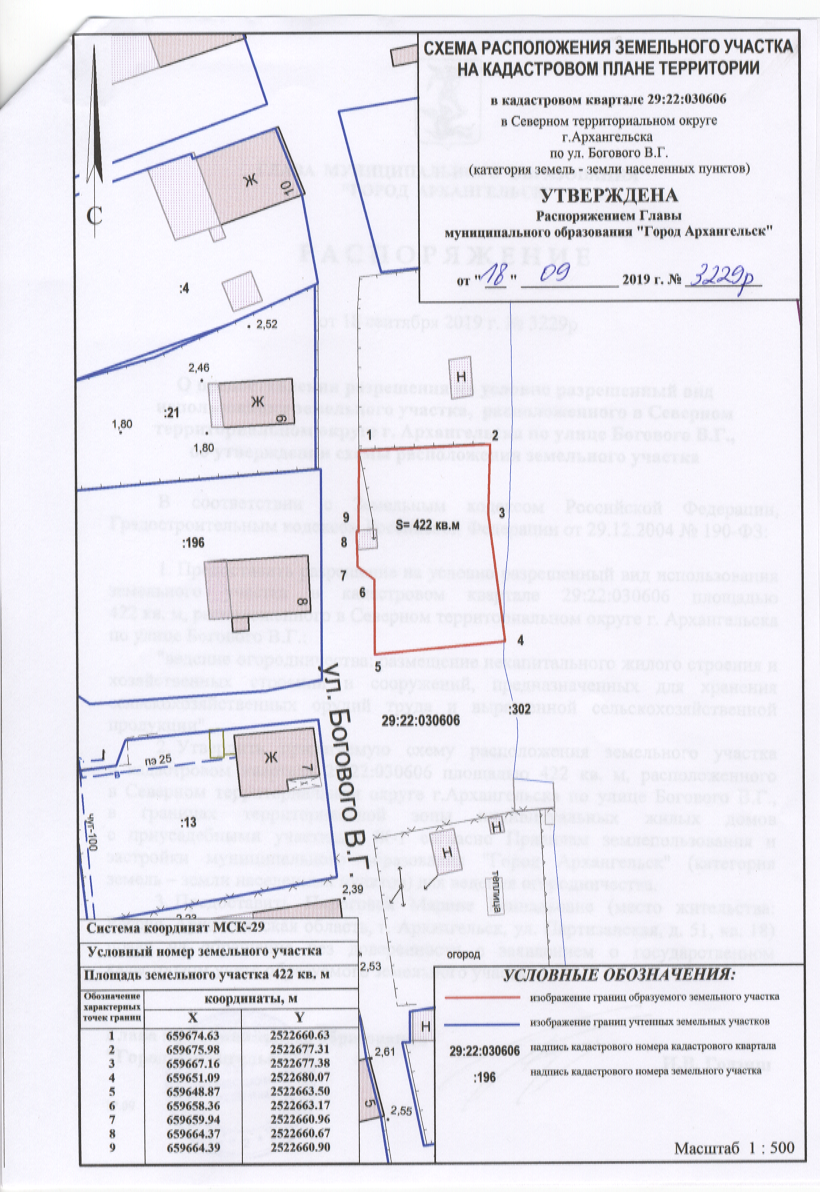 2. Утвердить прилагаемую схему расположения земельного участка в кадастровом квартале 29:22:030606 площадью 422 кв.м, расположенного в Северном территориальном округе г.Архангельска по улице Богового В.Г., в границах территориальной зоны индивидуальных жилых домов с приусадебными участкамиЖ-1 согласно Правилам землепользования и застройки муниципального образования "Город Архангельск" (категория земель – земли населенных пунктов) для ведения огородничества.
