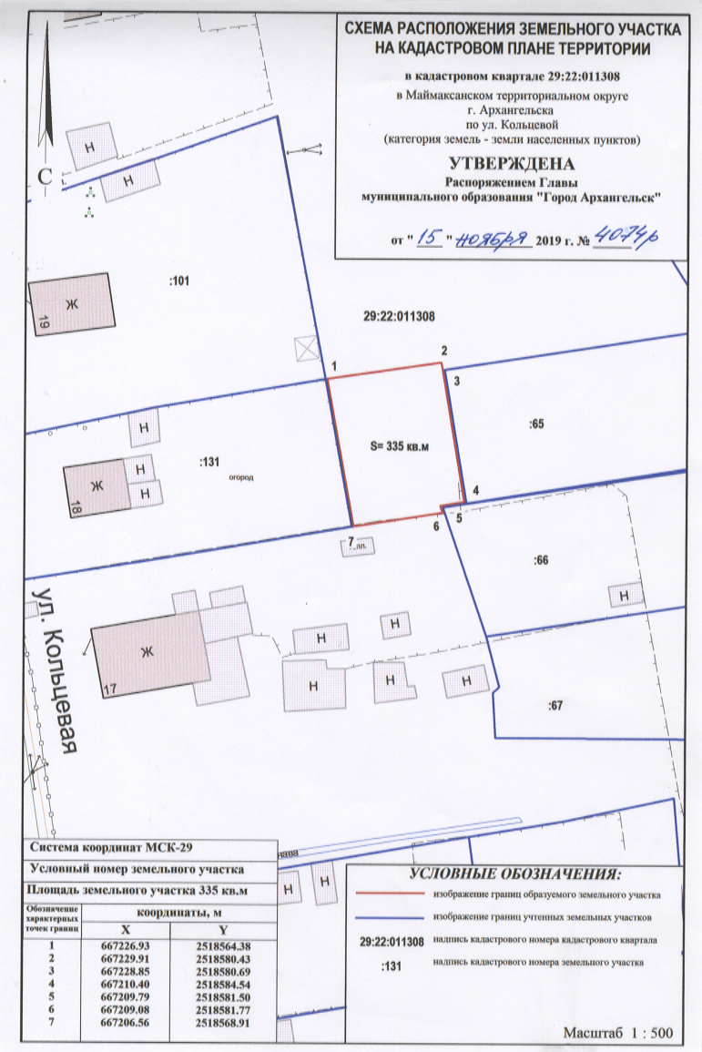 2. Утвердить прилагаемую схему расположения земельного участка в кадастровом квартале 29:22:011308 площадью 335 кв.м, расположенного в Маймаксанском территориальном округе г.Архангельска по улице Кольцевой, в границах территориальной зоны индивидуальных жилых домов с приусадебными участкамиЖ-1согласно Правилам землепользования и застройки муниципального образования "Город Архангельск" (категория земель – земли населенных пунктов) видом разрешенного использования для ведения огородничества.