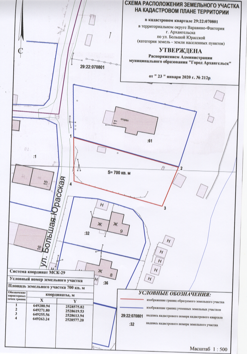 2. Утвердить прилагаемую схему расположения земельного участка в кадастровом квартале 29:22:070801 площадью 700 кв.м, расположенного в территориальном округе Варавино-Фактория г.Архангельска по улице Большой Юрасской, в границах территориальной зоны сельскохозяйственного использованияСХ-1согласно Правилам землепользования и застройки муниципального образования "Город Архангельск" (категория земель – земли населенных пунктов) с видом разрешенного использования для индивидуального жилищного строительства.