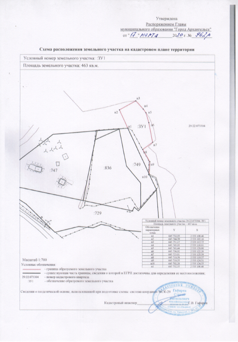 2. Утвердить прилагаемую схему расположения земельного участка в кадастровом квартале 29:22:073304 площадью 463 кв.м, расположенного в территориальном округе Варавино-Фактория г.Архангельска на территории КИЗ Силикат 1-я линия, в границах территориальной зоны зелёных насаждений специального пользования ЗНС-1 согласно Правилам землепользования и застройки муниципального образования "Город Архангельск" (категория земель – земли населенных пунктов) с видом разрешенного использования причалы для маломерных судов (размещение сооружений, предназначенных для причаливания, хранения и обслуживания яхт, катеров, лодок и других маломерных судов).