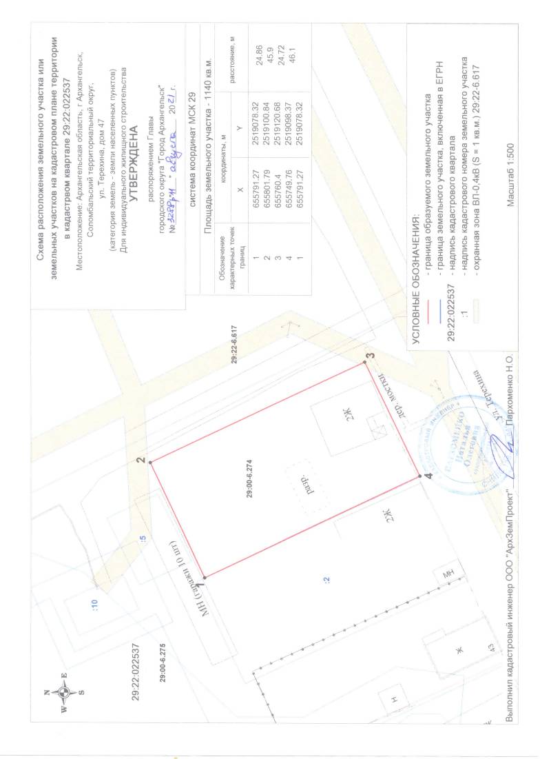 2. Утвердить схему расположения земельного участка в кадастровом квартале 29:22:022537 площадью 1 140 кв. м, расположенного в Соломбальском территориальном округе г. Архангельска по улице Терехина, в границах многофункциональная общественно-деловая зоны О1 согласно Правилам землепользования и застройки городского округа "Город Архангельск" (категория земель – земли населенных пунктов) с видом разрешенного использования "Для индивидуального жилищного строительства: Размещение жилого дома (отдельно стоящего здания количеством надземных этажей не более чем три, высотой не более двадцати метров, которое состоит из комнат и помещений вспомогательного использования, предназначенных для удовлетворения гражданами бытовых и иных нужд, связанных с их проживанием в таком здании, не предназначенного для раздела на самостоятельные объекты недвижимости); выращивание сельскохозяйственных культур; размещение индивидуальных гаражей и хозяйственных построек"