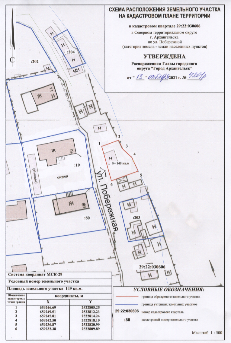 2. Утвердить прилагаемую схему расположения земельного участка площадью 149 кв. м, в кадастровом квартале 29:22:030606, расположенного в  Северном территориальном округе г. Архангельска по улице Побережной, в границах территориальной зоне застройки индивидуальными жилыми домами Ж1 согласно Правилам землепользования и застройки городского округа "Город Архангельск" (категория земель-земли населенных пунктов) с видом разрешенного использования "Ведение огородничества: размещение хозяйственных построек, не являющихся объектами недвижимости, предназначенных для хранения инвентаря и урожая сельскохозяйственных культур"