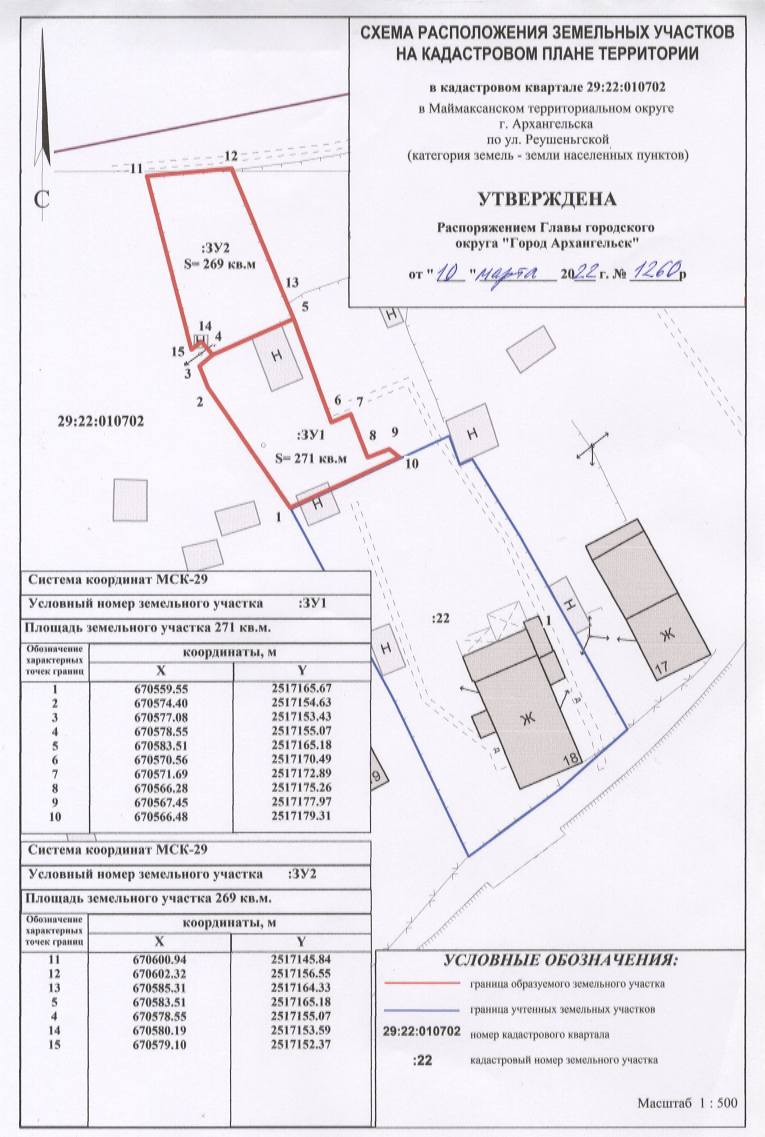 Распоряжение от 10 марта 2022 г. № 1260р "О предоставлении разрешения на условно разрешенный вид использования земельного участка, расположенного в Маймаксанском территориальном округе г. Архангельска по ул. Реушеньгской, об утверждении схемы расположения земельных участков"