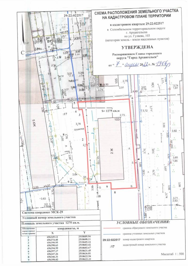 земельного участка в кадастровом квартале 29:22:022517 площадью 1 275 кв. м, расположенного в Соломбальском территориальном округе г. Архангельска по улице Гуляева, 103;