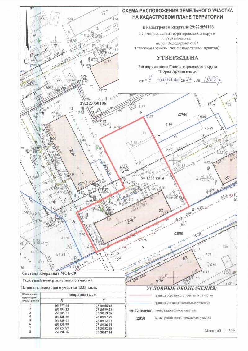 земельного участка в кадастровом квартале 29:22:050106 площадью 1 333 кв. м, расположенного в Ломоносовском территориальном округе г. Архангельска по улице Володарского, 83;