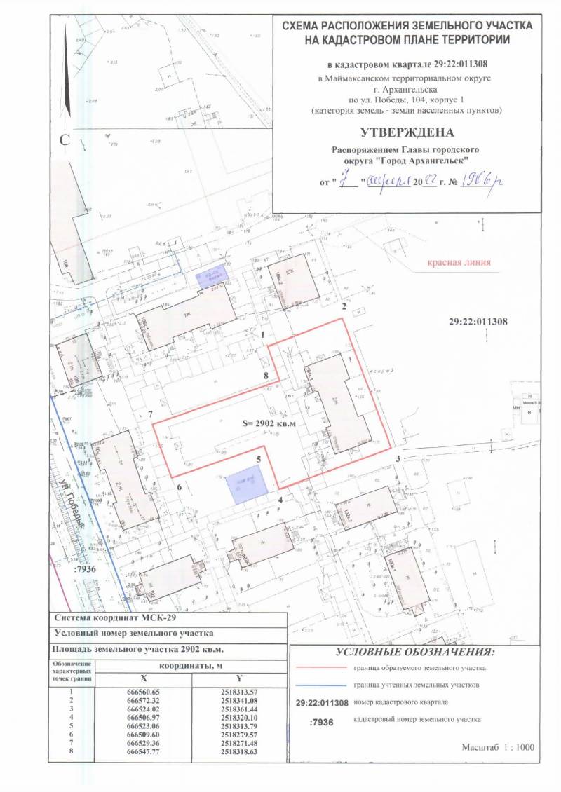 земельного участка в кадастровом квартале 29:22:011308 площадью 2 902 кв. м, расположенного в Маймаксанском территориальном округе г. Архангельска по улице Победы, 104, корпус 1
