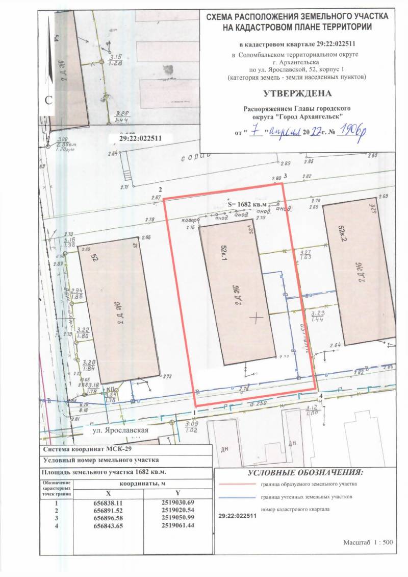 земельного участка в кадастровом квартале 29:22:022511 площадью 1 682 кв. м, расположенного в Соломбальском территориальном округе г. Архангельска по улице Ярославской, 52, корпус 1;