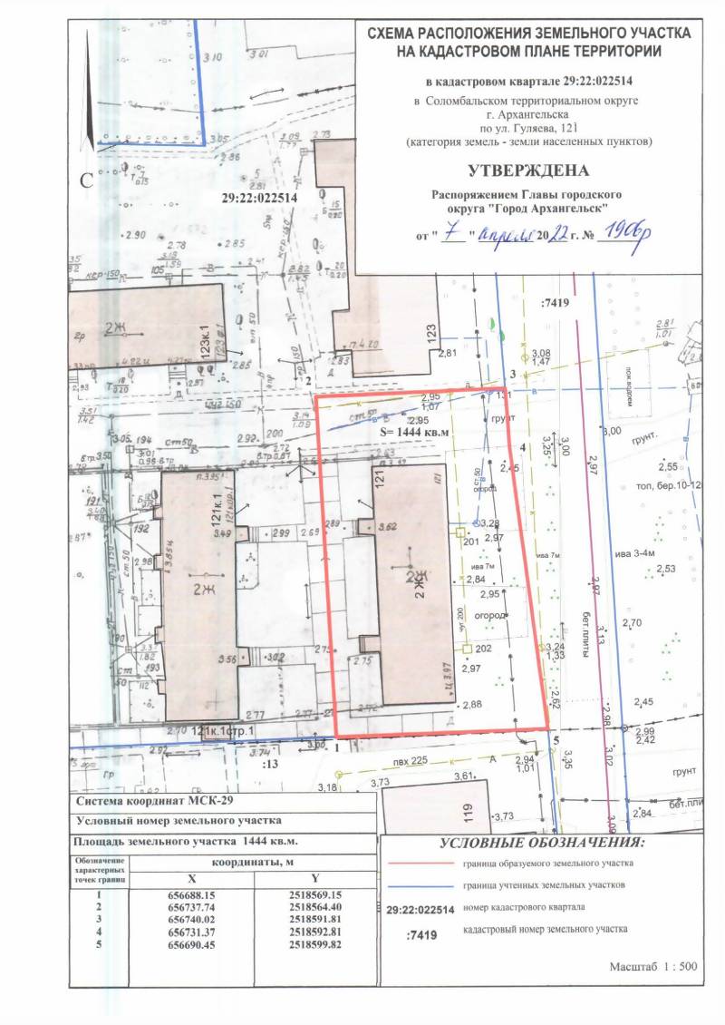 земельного участка в кадастровом квартале 29:22:022514 площадью 1 444 кв. м, расположенного в Соломбальском территориальном округе г. Архангельска по улице Гуляева, 121;