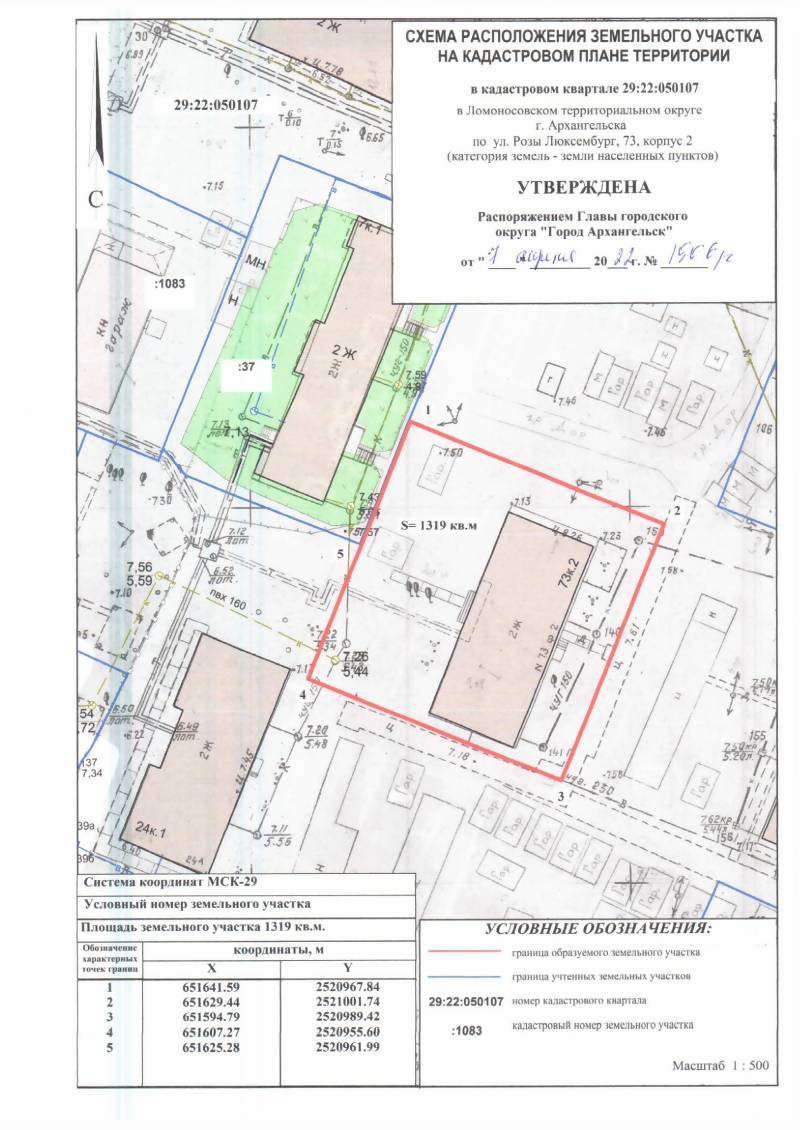 земельного участка в кадастровом квартале 29:22:050107 площадью 1 319 кв. м, расположенного в Ломоносовском территориальном округе г. Архангельска по улице Розы Люксембург, 73, корпус 2;