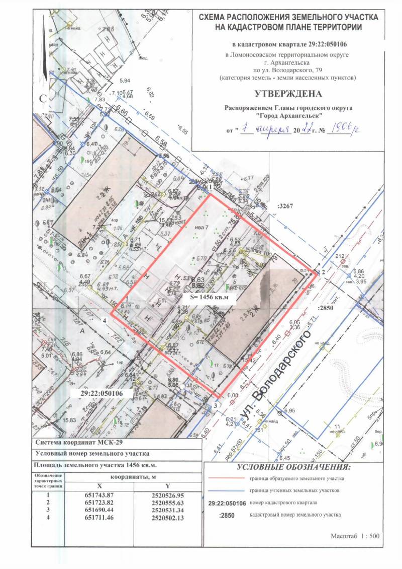 земельного участка в кадастровом квартале 29:22:050106 площадью 1 456 кв. м, расположенного в Ломоносовском территориальном округе г. Архангельска по улице Володарского, 79;