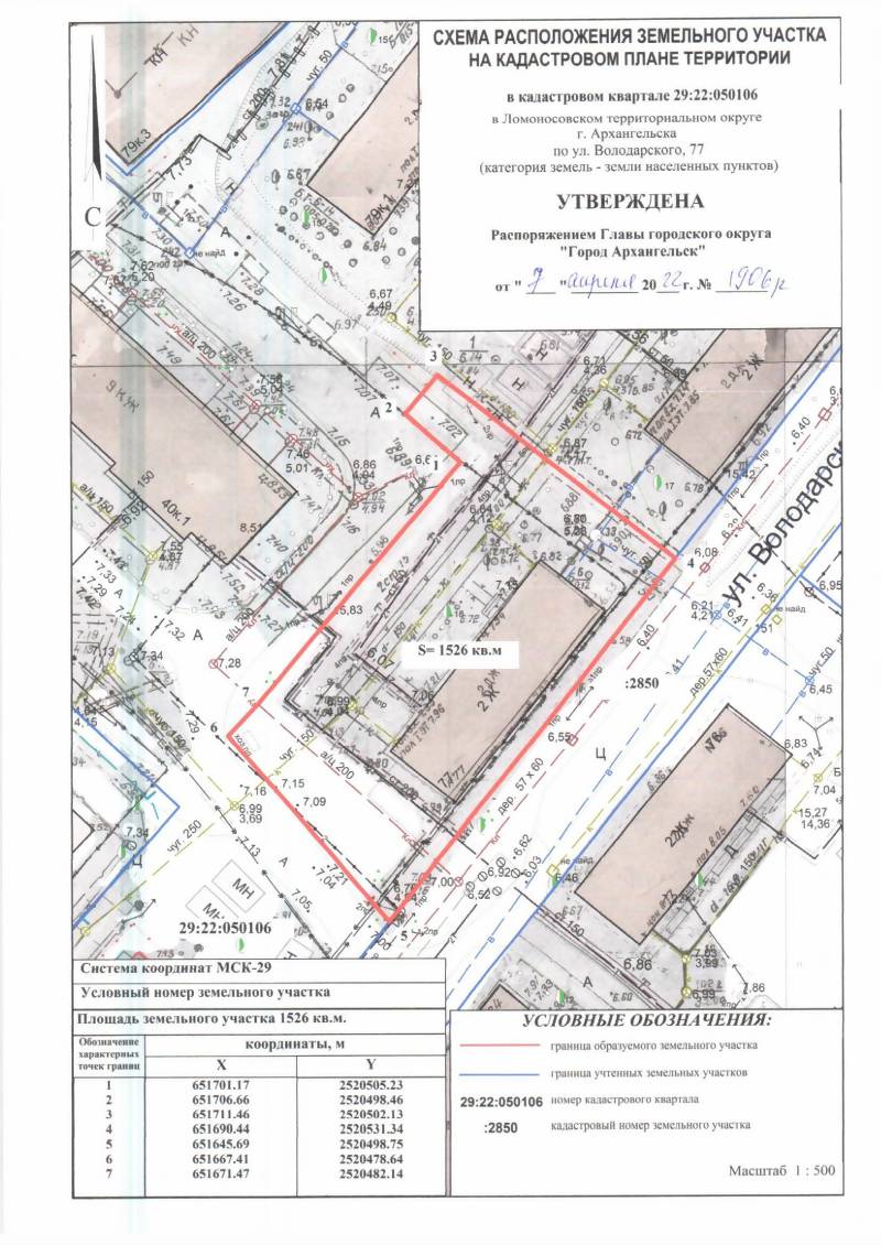 земельного участка в кадастровом квартале 29:22:050106 площадью 1 526 кв. м, расположенного в Ломоносовском территориальном округе г. Архангельска по улице Володарского, 77;