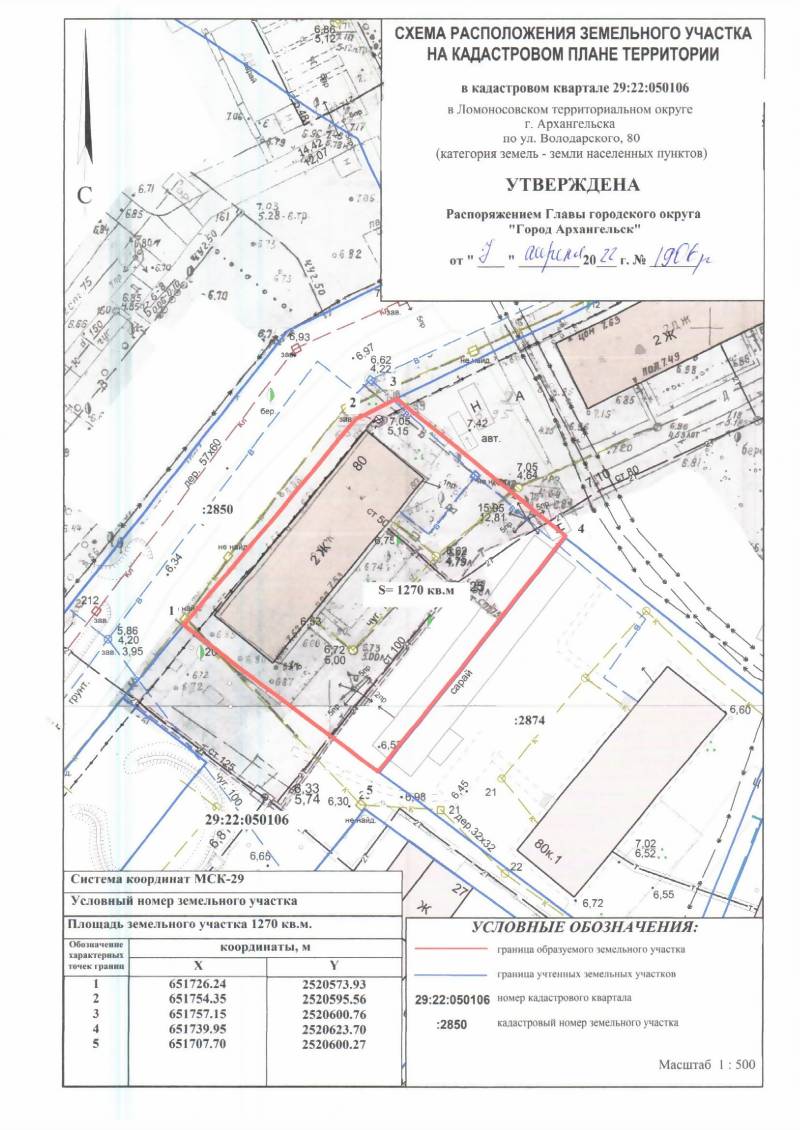 земельного участка в кадастровом квартале 29:22:050106 площадью 1 270 кв. м, расположенного в Ломоносовском территориальном округе г. Архангельска по улице Володарского, 80;
