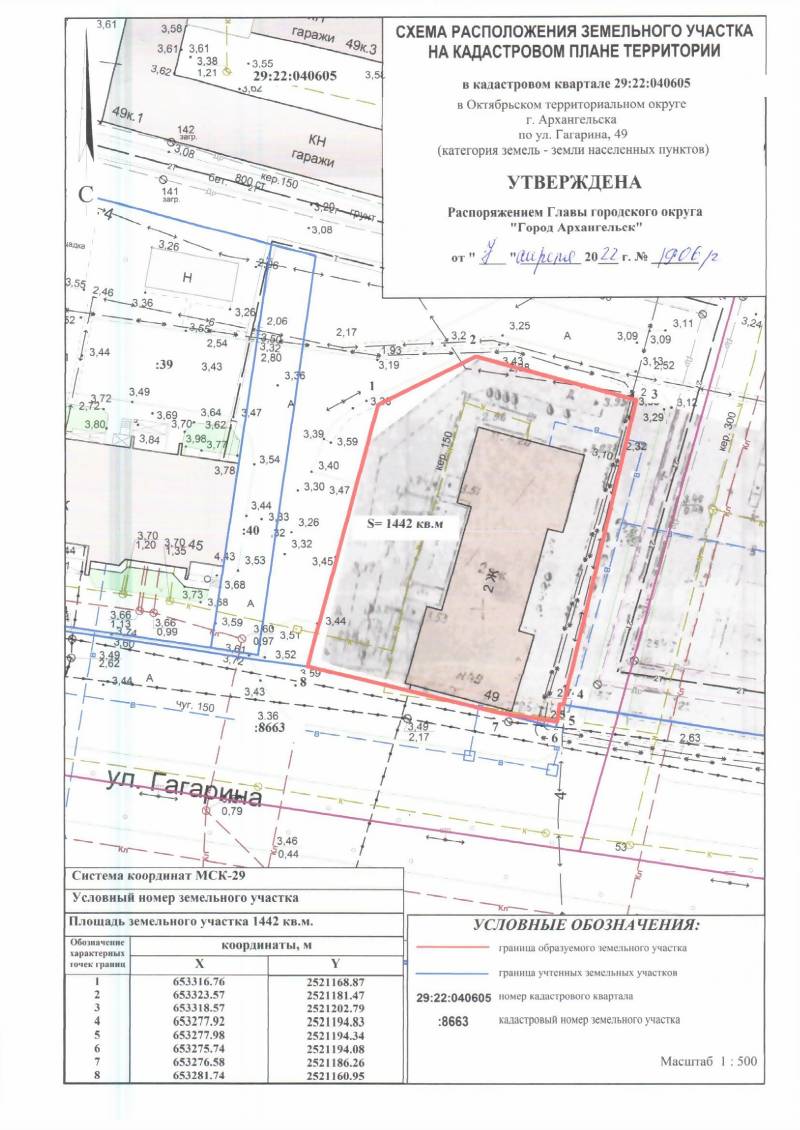 земельного участка в кадастровом квартале 29:22:040605 площадью 1 442 кв. м, расположенного в Октябрьском территориальном округе г. Архангельска по улице Гагарина, 49;