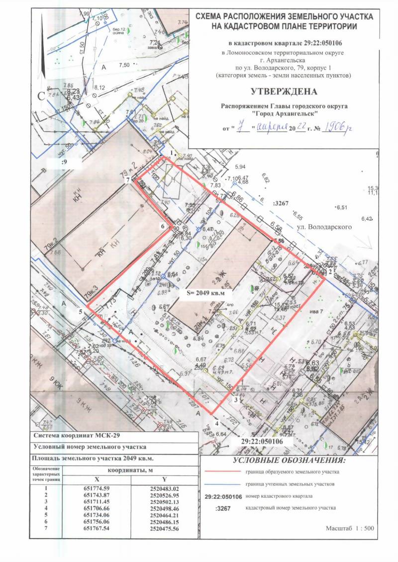 земельного участка в кадастровом квартале 29:22:050106 площадью 2 049 кв. м, расположенного в Ломоносовском территориальном округе г. Архангельска по улице Володарского, 79, корпус 1;