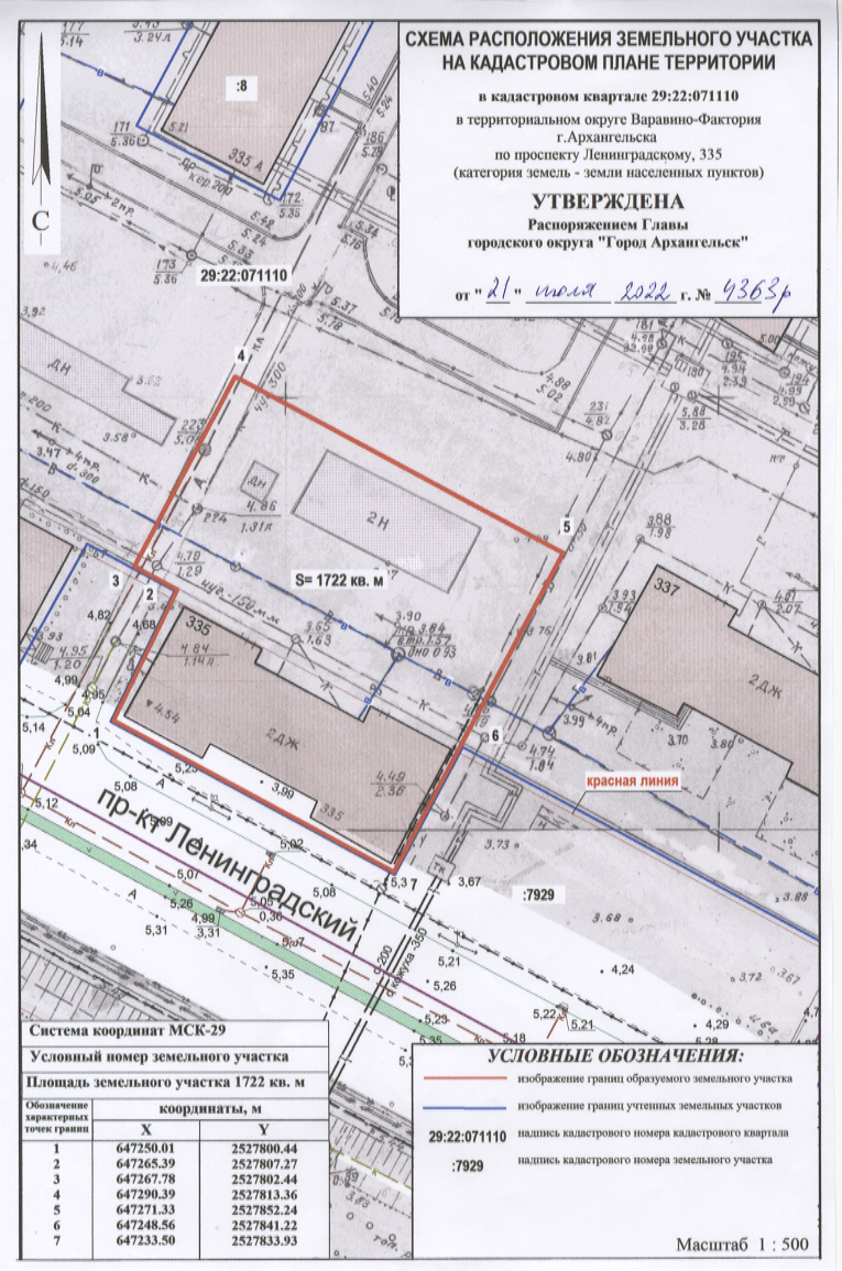 2. Утвердить прилагаемую схему расположения земельного участка в кадастровом квартале 29:22:071110 площадью 1 722 кв. м, расположенного в территориальном округе Варавино-Фактория г. Архангельска по проспекту Ленинградскому, 335 в границах зоны застройки среднеэтажными жилыми домами Ж3 согласно Правилам землепользования и застройки городского округа "Город Архангельск" (категория земель – земли населенных пунктов с видом разрешенного использования "малоэтажная многоквартирная жилая застройка: размещение малоэтажных многоквартирных домов (многоквартирные дома высотой до 4 этажей, включая мансардный); обустройство спортивных и детских площадок, площадок для отдыха; размещение объектов обслуживания жилой застройки во встроенных, пристроенных и встроенно-пристроенных помещениях малоэтажного многоквартирного дома, если общая площадь таких помещений в малоэтажном многоквартирном доме не составляет более 15 % общей площади помещений дома.".