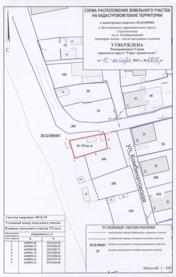 2.Утвердить прилагаемую схему расположения земельного участка площадью 175 кв. м в кадастровом квартале 29:22:090401, расположенного в Цигломенском территориальном округе г. Архангельска по