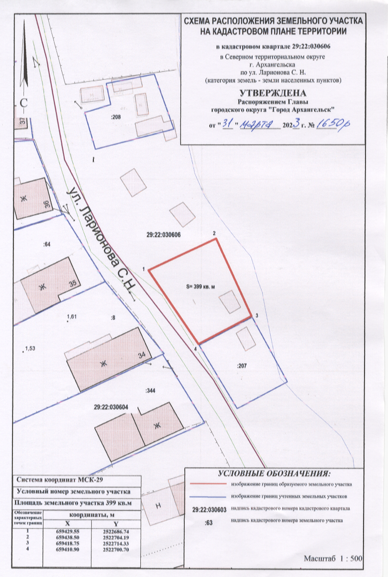 Распоряжение от 31 марта 2023 г. № 1650р "О предоставлении разрешения на условно разрешенный вид использования земельного участка, расположенного в Северном территориальном округе г. Архангельска по улице Ларионова С.Н., об утверждении схемы расположения земельного участка"
