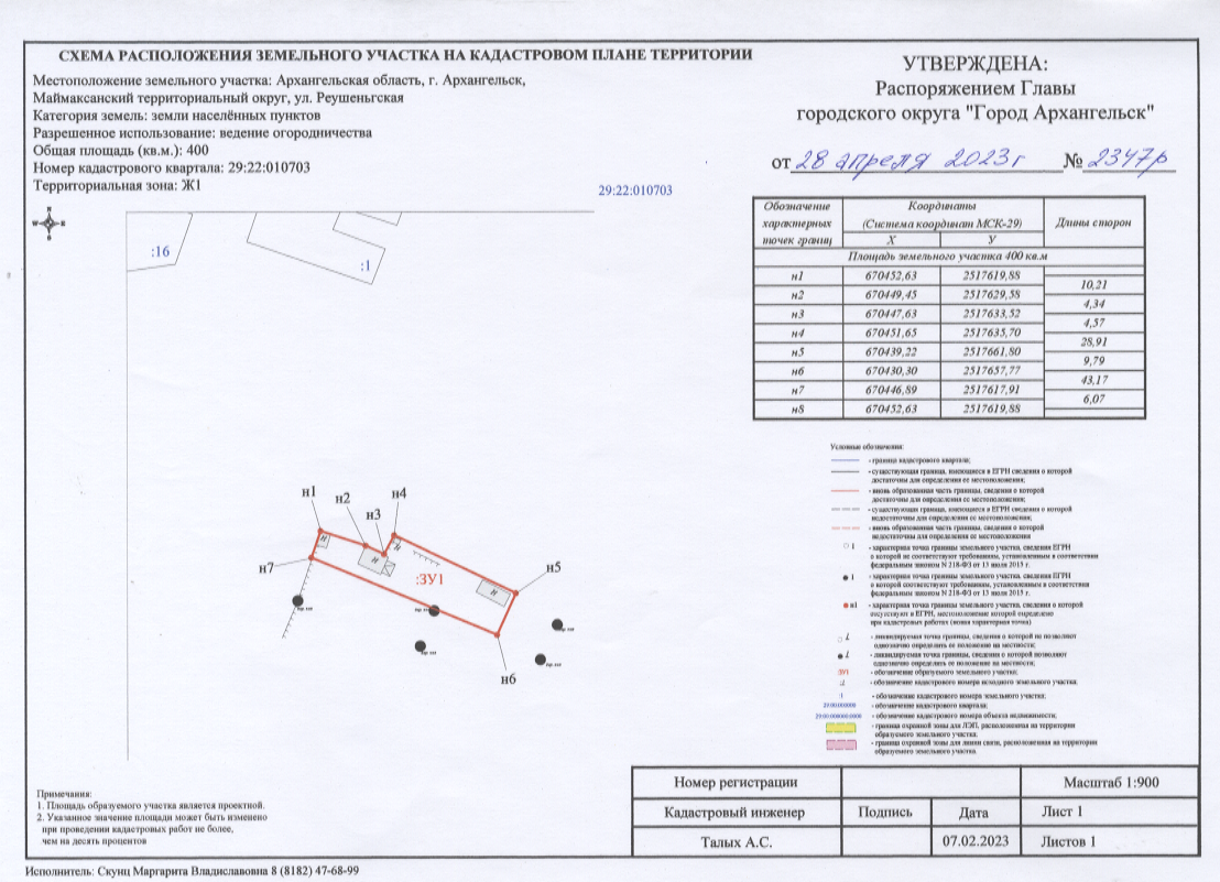 2. Утвердить прилагаемую схему расположения земельного участка площадью 400 кв. м в кадастровом квартале 29:22:010703, расположенного в Маймаксанском территориальном округе г. Архангельска по ул. Реушеньгской, в границах территориальной зоны застройки индивидуальными жилыми домами Ж1 согласно Правилам землепользования и застройки городского округа "Город Архангельск" (категория земель – земли населенных пунктов) с видом разрешенного использования "Ведение огородничества: размещение хозяйственных построек, не являющихся объектами недвижимости, предназначенных для хранения инвентаря и урожая сельскохозяйственных культур".