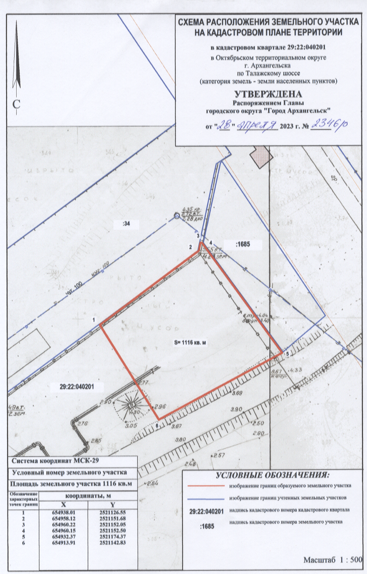 2.   Утвердить прилагаемую схему расположения земельного участка в кадастровом квартале 29:22:040201 площадью 1 116 кв. м, расположенного в Октябрьском территориальном округе г. Архангельска по Талажскому шоссе в границах зоны смешанной и общественно-деловой застройки О1-1 согласно Правилам землепользования и застройки городского округа "Город Архангельск" (категория земель – земли населенных пунктов) с видом разрешенного использования "Объекты дорожного сервиса: Размещение зданий и сооружений дорожного сервиса. Содержание данного вида разрешенного использования включает в себя содержание видов разрешенного использования с кодами 4.9.1.1 - 4.9.1.4".