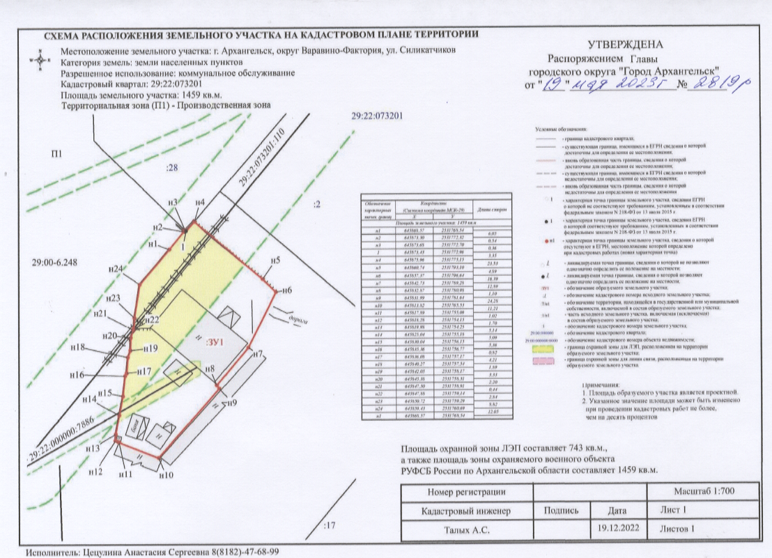 2.Утвердить прилагаемую схему расположения земельного участка площадью 1 459  кв. м, в кадастровом квартале 29:22:073201, расположенного в  территориальном округе Варавино-Фактория г.Архангельска по улице Силикатчиков, 15, корпус 1 в границах производственной территориальной зоны П1 согласно Правилам землепользования и застройки городского округа "Город Архангельск" (категория земель – земли населенных пунктов) с видом разрешенного использования "Коммунальное обслуживание".