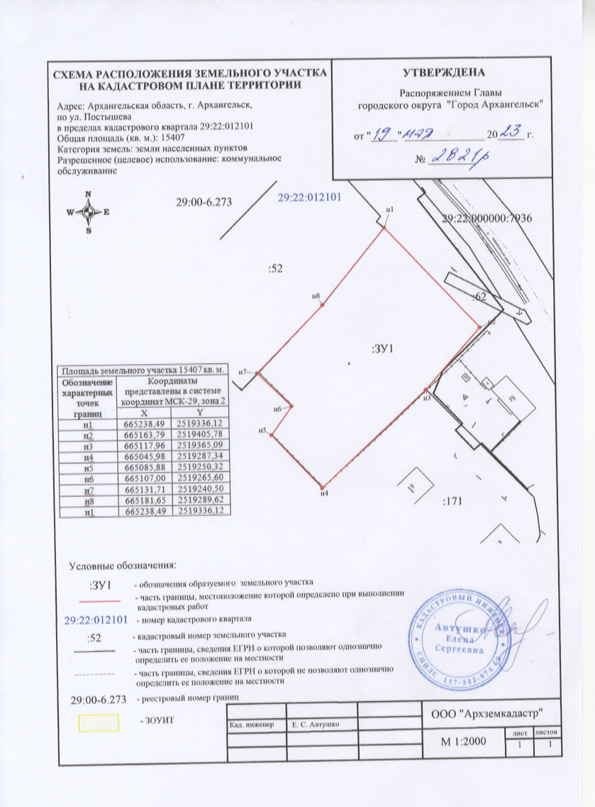Распоряжение от 19 мая 2023 г. № 2821р "О предоставлении разрешения на условно разрешенный вид использования земельного участка, расположенного в Маймаксанском территориальном округе г. Архангельска улице Постышева, об утверждении схемы расположения земельного участка"