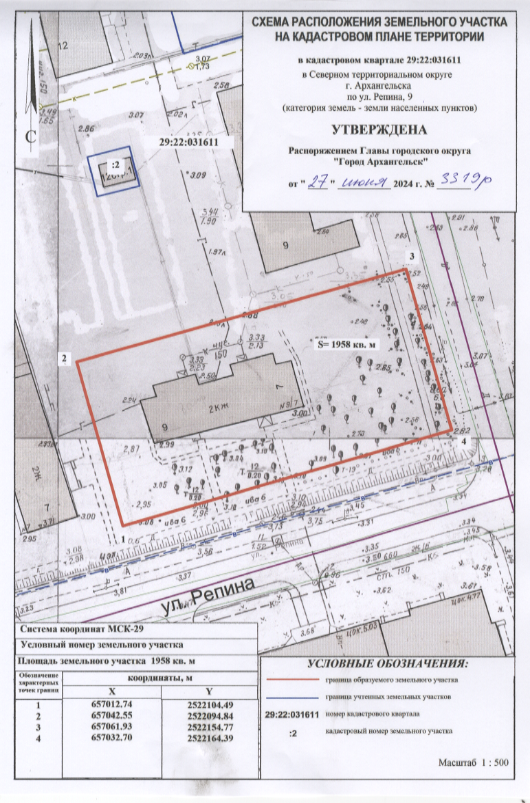 земельного участка площадью 1 958 кв. м в кадастровом квартале 29:22:031611, расположенного в Северном территориальном округе г. Архангельска по улице Репина, 9;