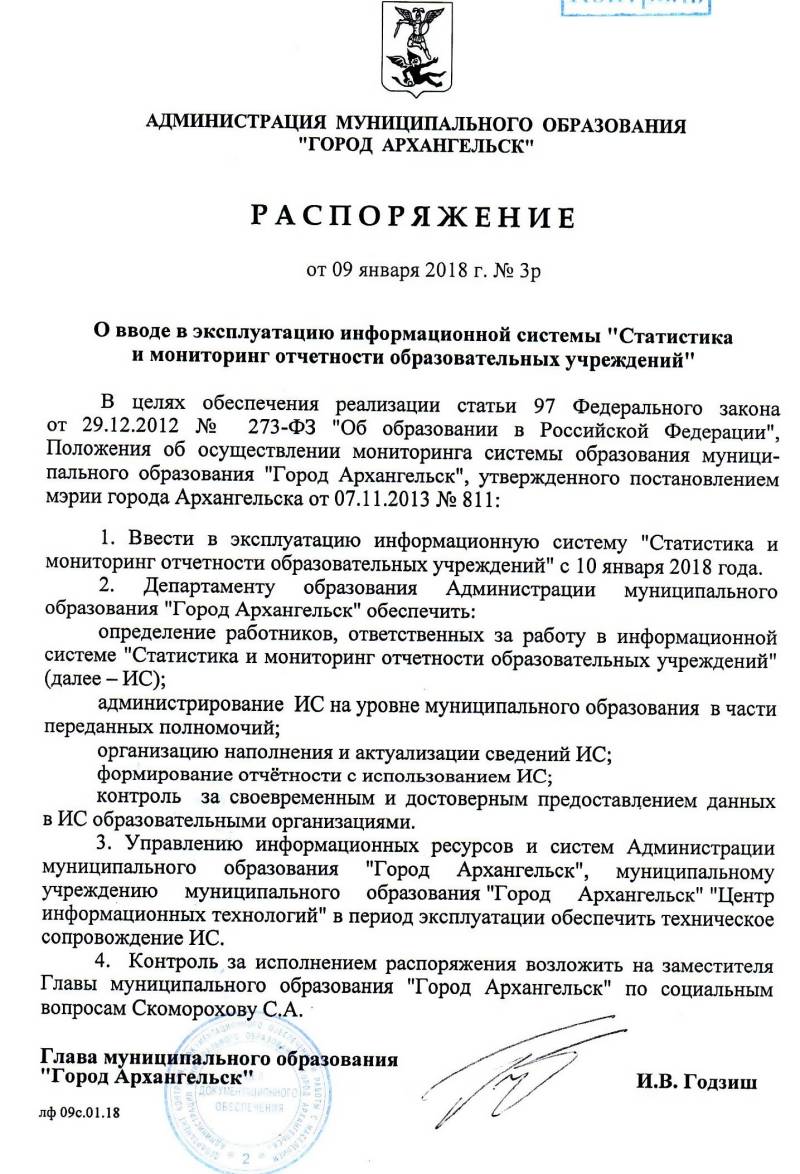 Распоряжение Администрации муниципального образования "Город Архангельск" от 09.01.2017 № 3р "О вводе в эксплуатацию информационной системы "Статистика и мониторинг отчетности образовательных учреждений"