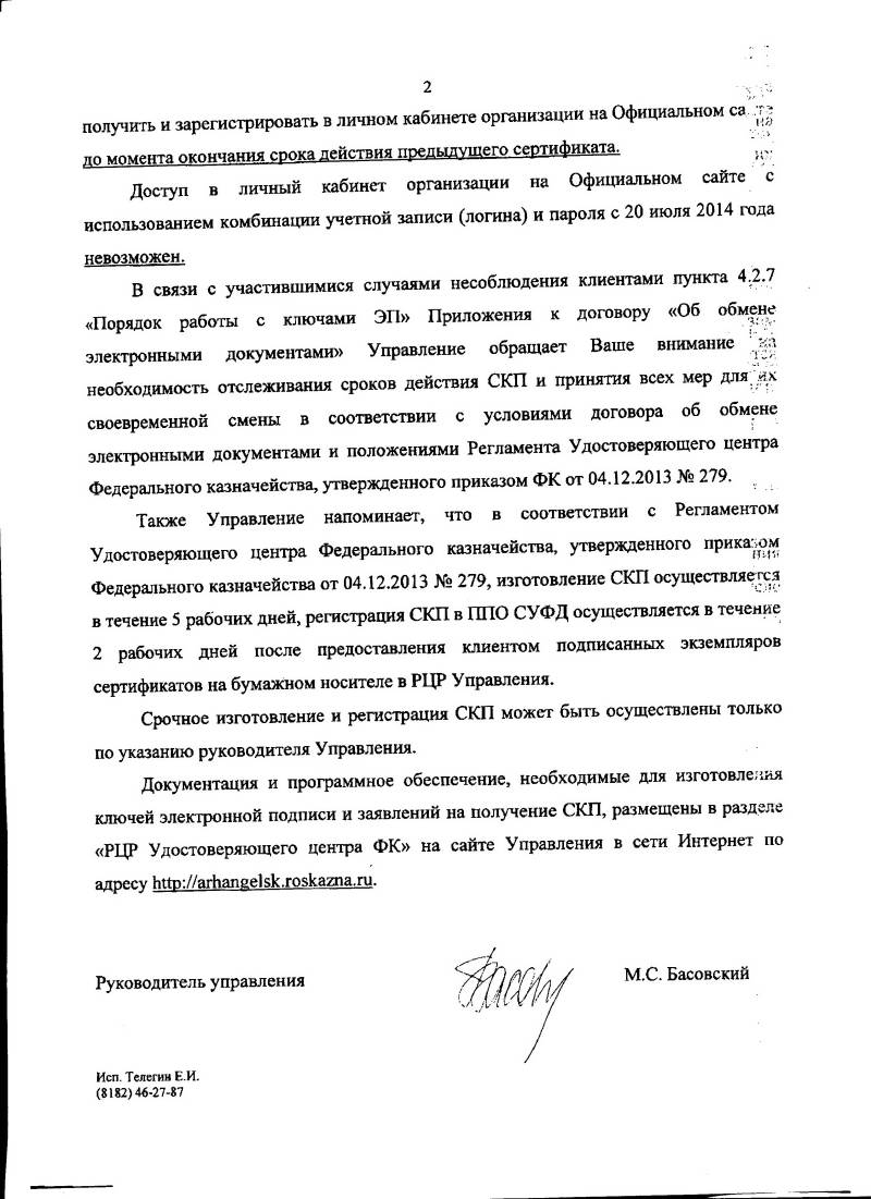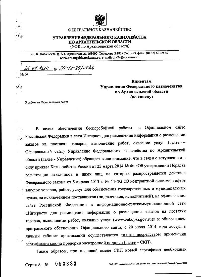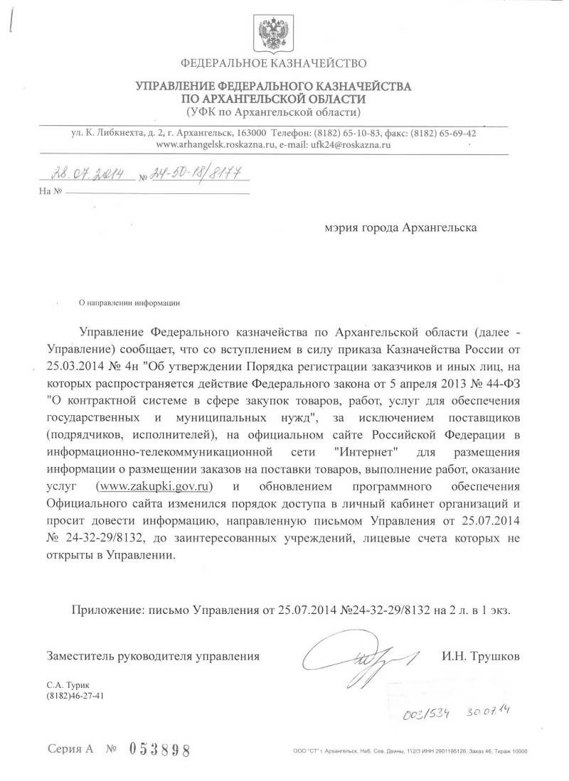 41. Письмо УФК по Архангельской области от 28.07.2014 №24-50-18/8177  о порядке доступа в личный кабинет на Официальном сайте