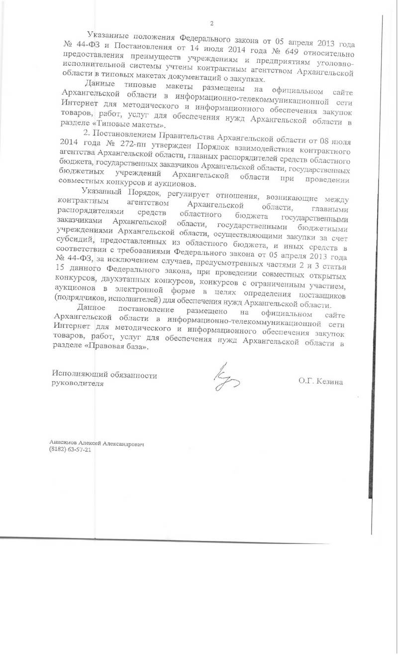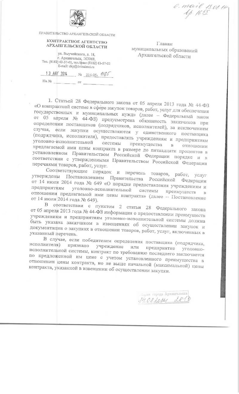 43. Письмо Контрактного агентства Архангельской области от 13.08.2014 №314-05-1165, продолжение письма о преимуществах учреждениям УФСИН, о совместных торгах
