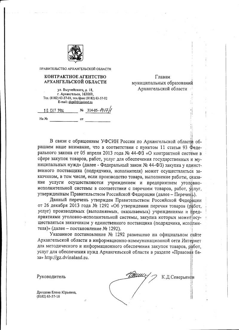 59. Письмо Контрактного агентства Архангельской области от 16.10.2014 №314-05-1417/1 о закупке товаров (работ, услуг), производимых (выполняемых, оказываемых) учреждениями, предприятиями уголовно-исполнительной системы.