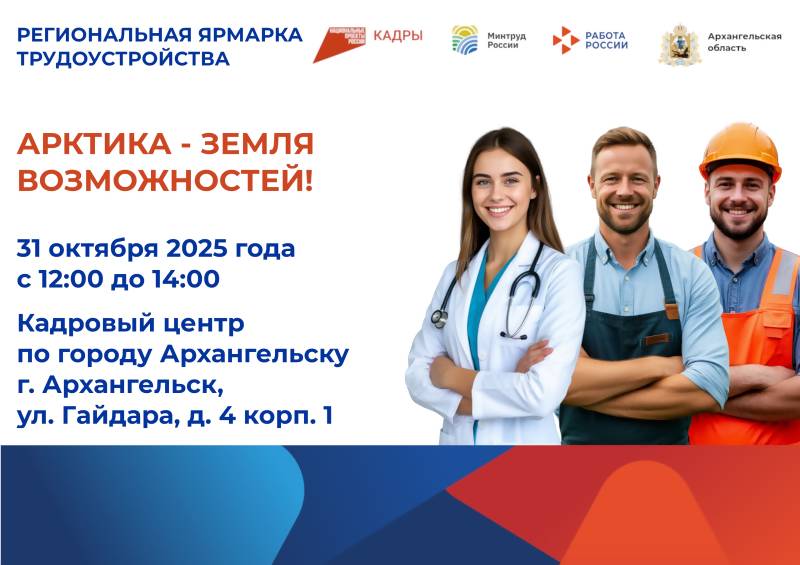 31 октября с 12:00 до 14:00 в кадровом центре по городу Архангельску пройдёт Региональная ярмарка трудоустройства “Арктика - земля возможностей!”,