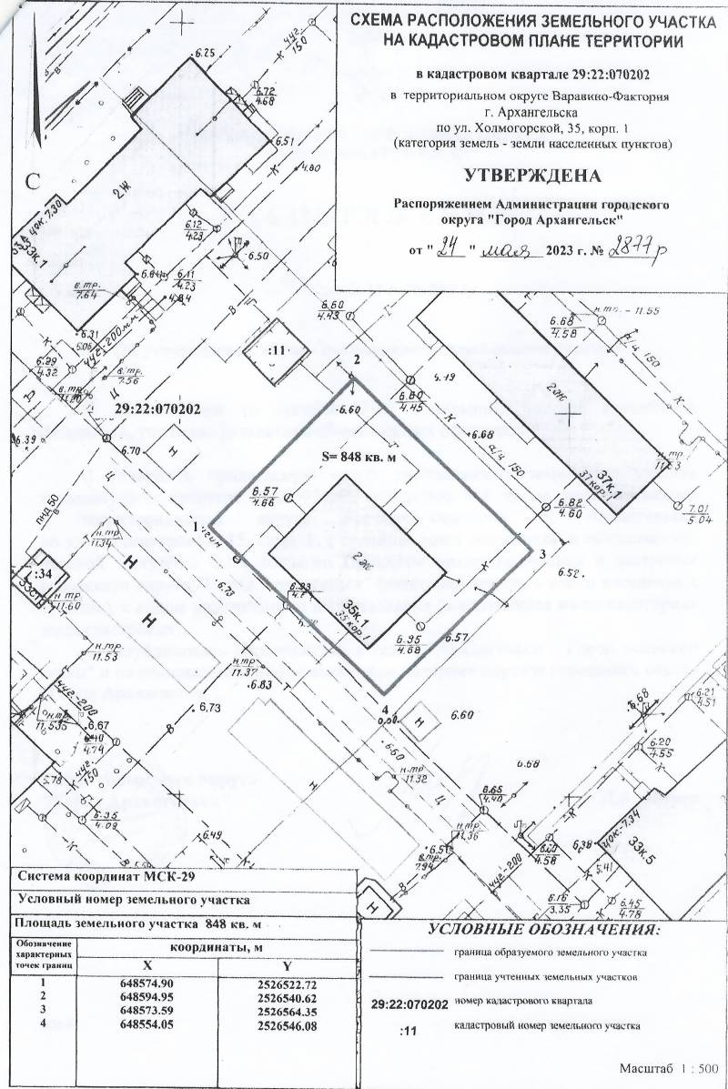 2. Адрес месторасположения земельного участка: г. Архангельск, ул. Холмогорская, д. 35, корп. 1. Данный земельный участок расположен в кадастровом квартале 29:22:070202. Утвержденная схема расположения земельного участка: