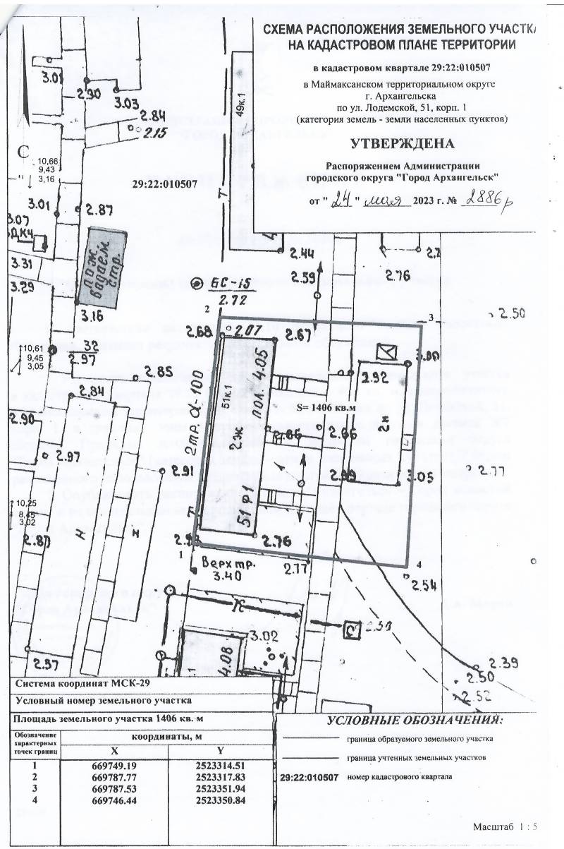 2. Адрес месторасположения земельного участка: г. Архангельск, ул. Лодемская, д. 51, корп. 1. Данный земельный участок расположен в кадастровом квартале 29:22:010507. Утвержденная схема расположения земельного участка: