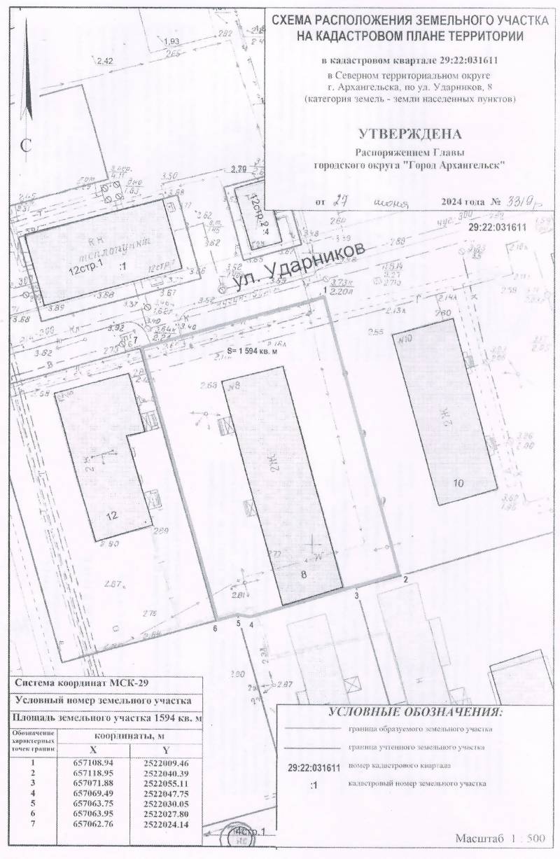 2. Адрес месторасположения земельного участка: г. Архангельск, ул. Ударников, д. 8. Данный земельный участок расположен в кадастровом квартале 29:22:031611. Утвержденная схема расположения земельного участка: