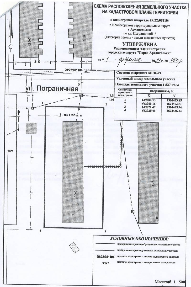 2. Адрес месторасположения земельного участка: г. Архангельск, ул. Пограничная, д. 6. Данный земельный участок расположен в кадастровом квартале 29:22:081104. Утвержденная схема расположения земельного участка: