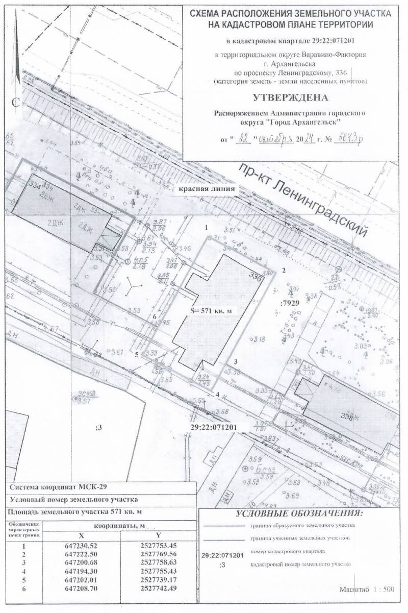 2. Адрес месторасположения земельного участка: г. Архангельск, просп. Ленинградский, д. 336. Данный земельный участок расположен в кадастровом квартале 29:22:071201. Утвержденная схема расположения земельного участка: