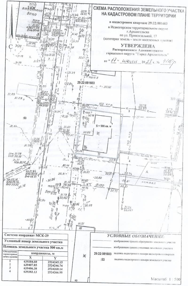 2. Адрес месторасположения земельного участка: г. Архангельск, ул. Привокзальная, д. 17. Данный земельный участок расположен в кадастровом квартале 29:22:081603. Утвержденная схема расположения земельного участка: