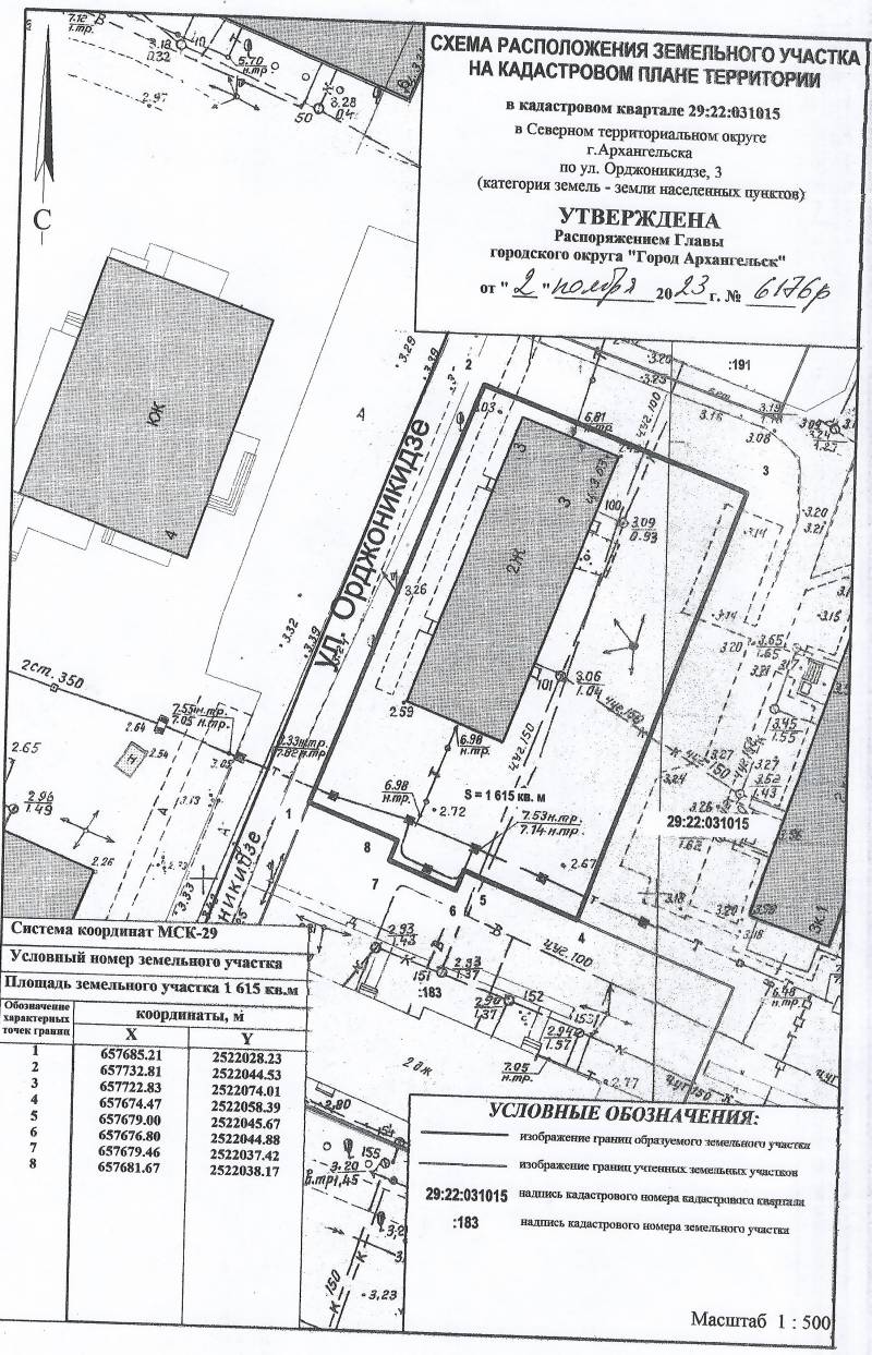 2. Адрес месторасположения земельного участка: г. Архангельск, ул. Орджоникидзе, д. 3. Данный земельный участок расположен в кадастровом квартале 29:22:031015. Утвержденная схема расположения земельного участка: