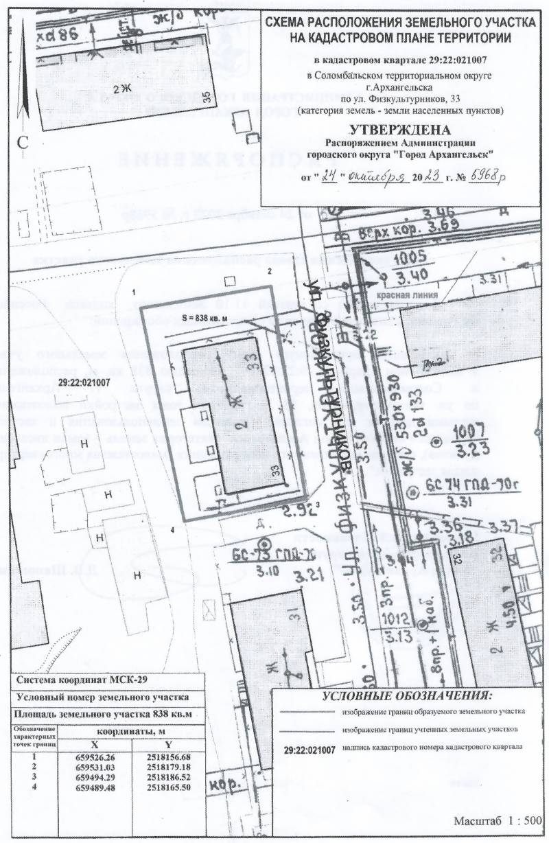 2. Адрес месторасположения земельного участка: г. Архангельск, ул. Физкультурников, д. 33. Данный земельный участок расположен в кадастровом квартале 29:22:021007. Утвержденная схема расположения земельного участка: