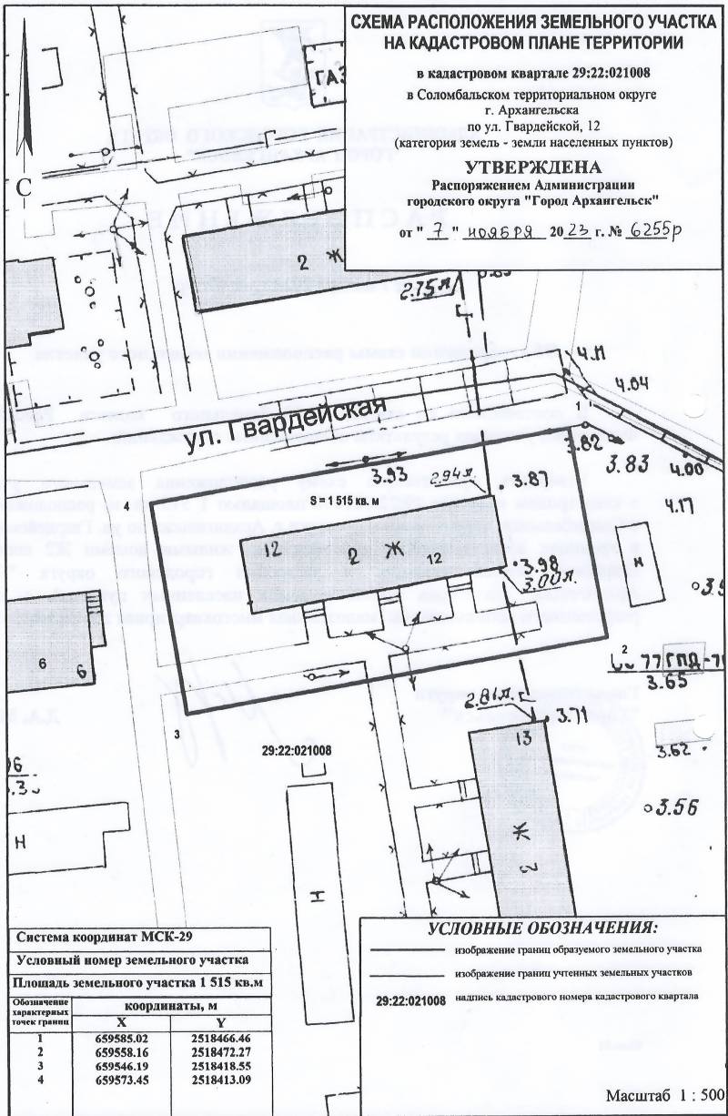 2. Адрес месторасположения земельного участка: г. Архангельск, ул. Гвардейская, д. 12. Данный земельный участок расположен в кадастровом квартале 29:22:021008. Утвержденная схема расположения земельного участка: