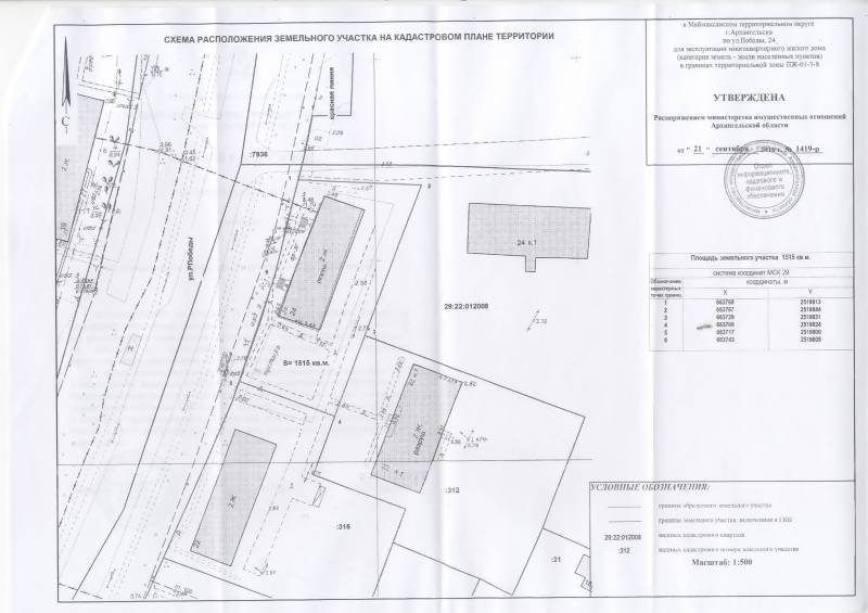 2. Адрес месторасположения земельного участка: г. Архангельск, ул. Победы, д. 24 Данный земельный участок расположен в кадастровом квартале 29:22:012008. Утвержденная схема расположения земельного участка: