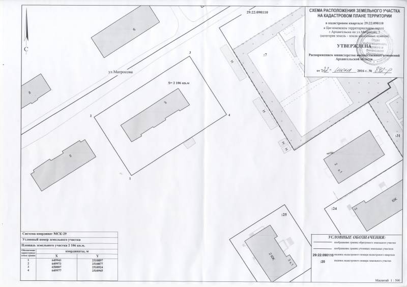 2. Адрес месторасположения земельного участка: г. Архангельск, ул. Матросова, д. 3. Данный земельный участок расположен в кадастровом квартале 29:22:090110. Утвержденная схема расположения земельного участка: