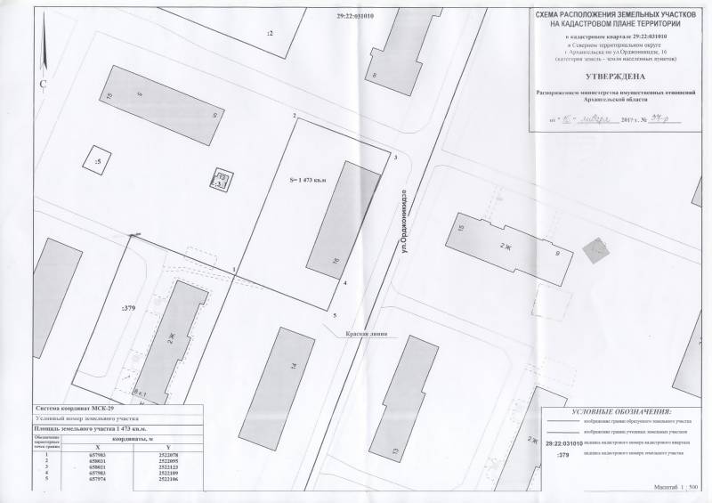 2. Адрес месторасположения земельного участка: г. Архангельск, ул. Орджоникидзе, д. 16. Данный земельный участок расположен в кадастровом квартале 29:22:031010. Утвержденная схема расположения земельного участка: