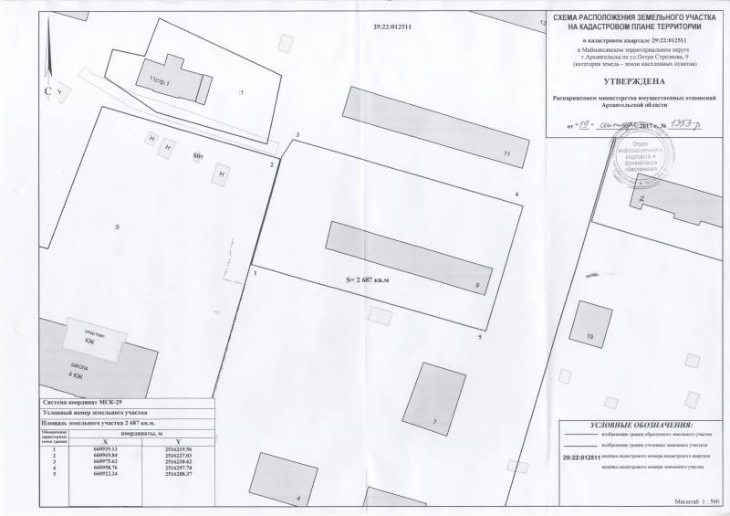 2. Адрес месторасположения земельного участка: г. Архангельск, ул. Петра Стрелкова, д. 9. Данный земельный участок расположен в кадастровом квартале 29:22:012511. Утвержденная схема расположения земельного участка:
