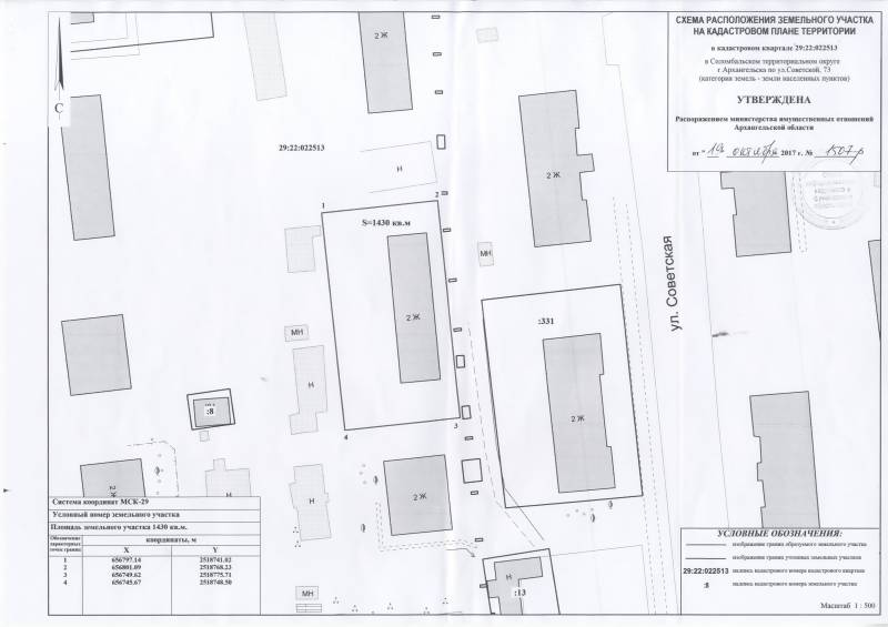 2. Адрес месторасположения земельного участка: г. Архангельск, ул. Советская, д. 73. Данный земельный участок расположен в кадастровом квартале 29:22:022513. Утвержденная схема расположения земельного участка: